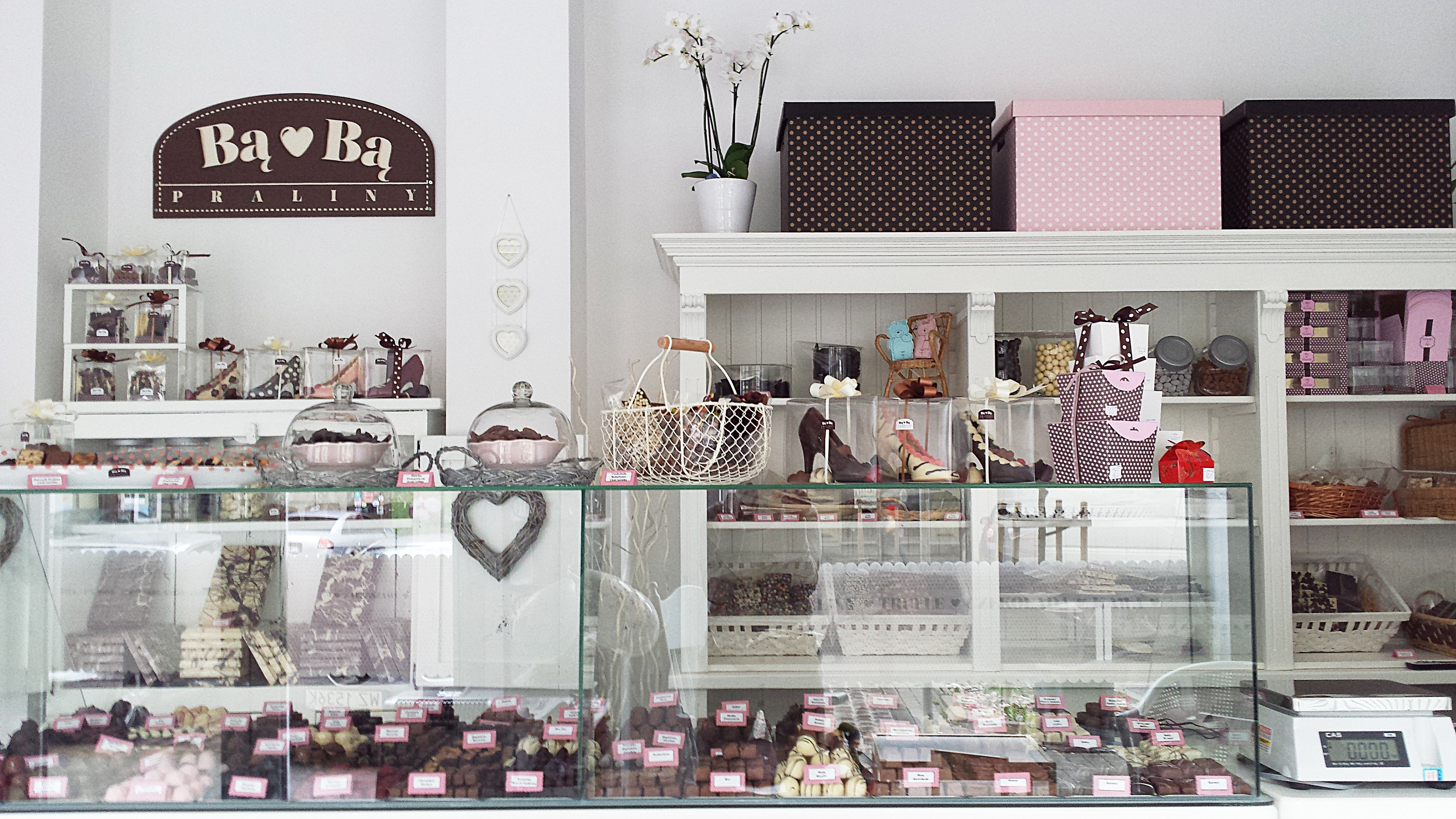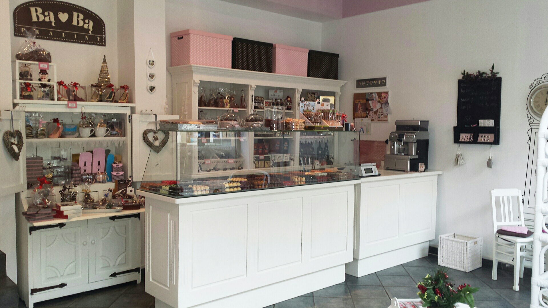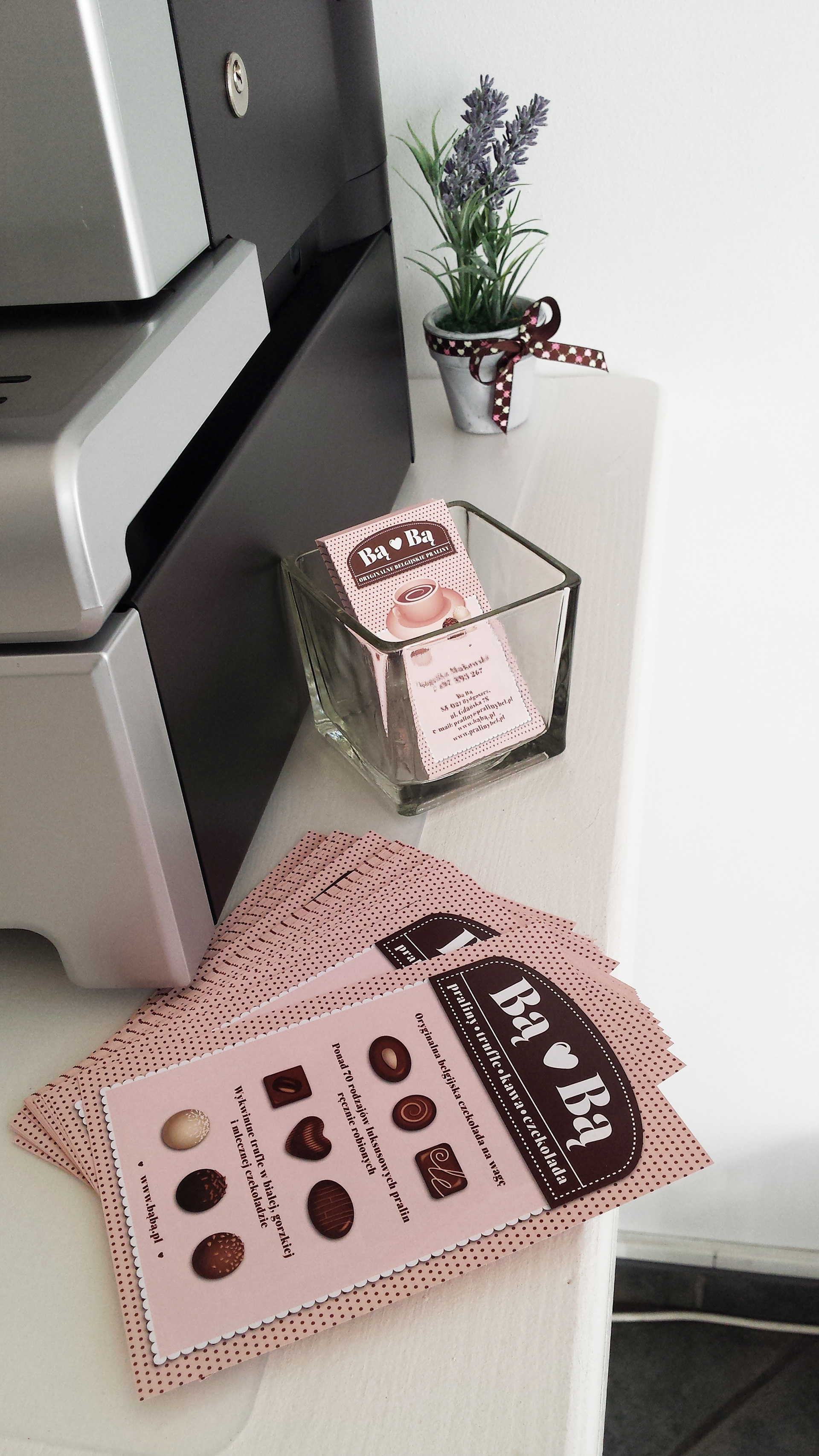 Logo i jednocześnie projekt szyldu oraz inne materiały promocyjne (naklejki, ulotki, katalogi świąteczne, vouchery itp.) dla kawiarni i sklepu z belgijskimi pralinami BąBą (2014) / Logo - signboard and other graphic materials (stickers, flyers, Christmas catalogs, vouchers, etc.) for coffeeshop with Belgian pralines BąBą (2014) /