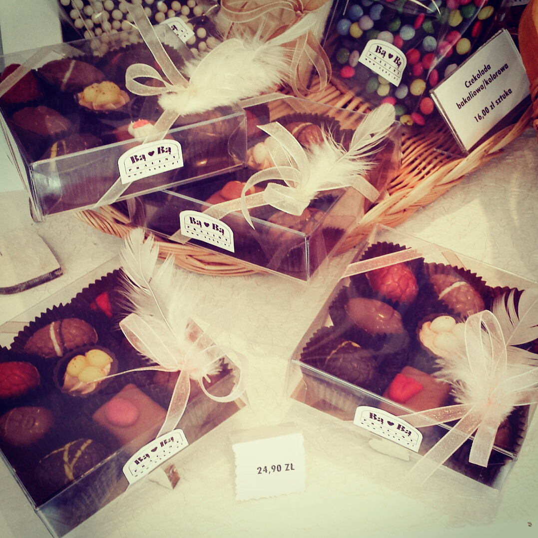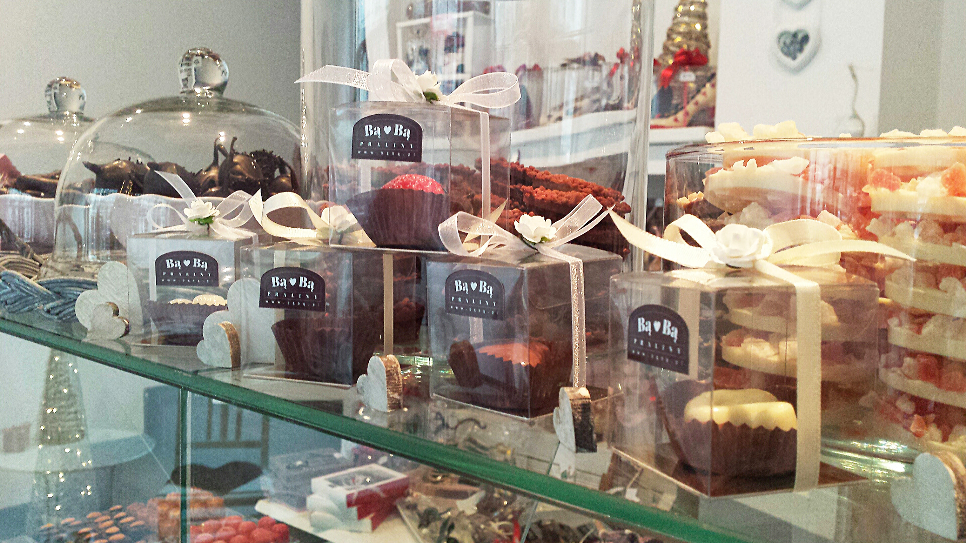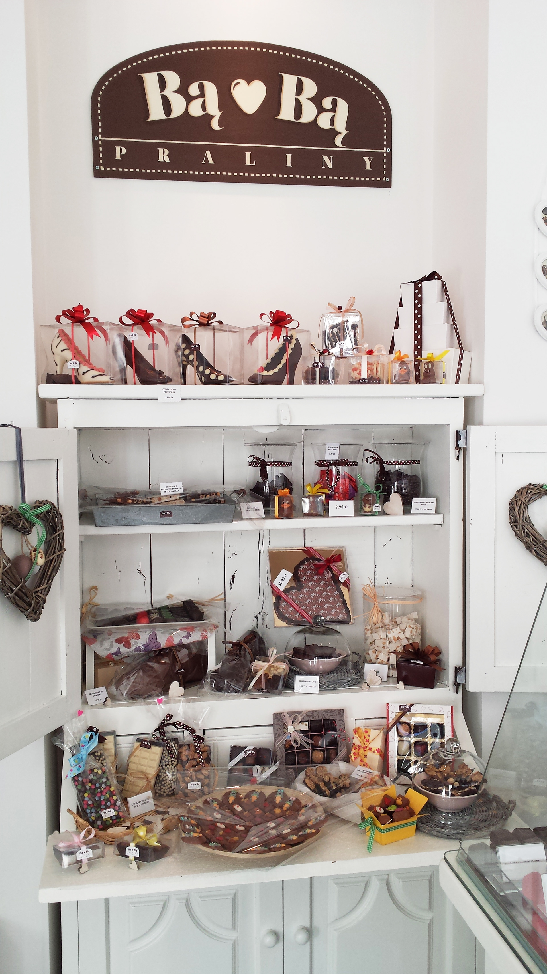 Logo i jednocześnie projekt szyldu oraz inne materiały promocyjne (naklejki, ulotki, katalogi świąteczne, vouchery itp.) dla kawiarni i sklepu z belgijskimi pralinami BąBą (2014) / Logo - signboard and other graphic materials (stickers, flyers, Christmas catalogs, vouchers, etc.) for coffeeshop with Belgian pralines BąBą (2014) /