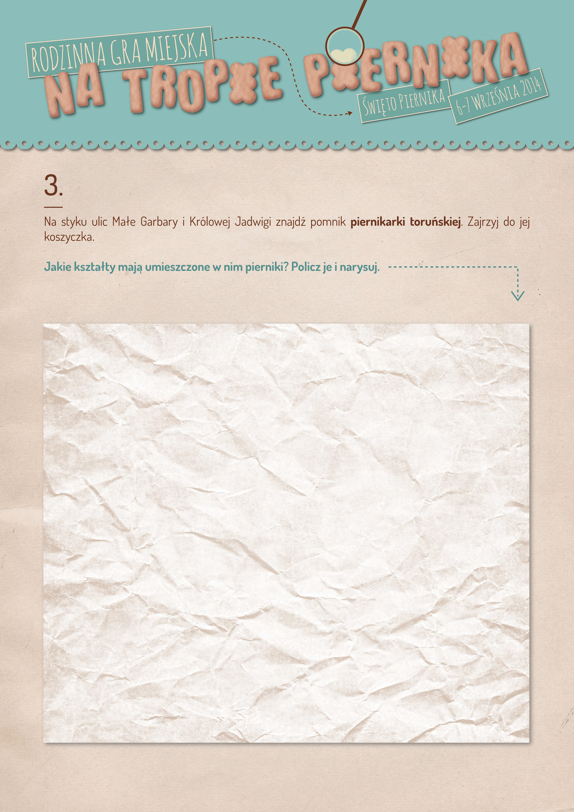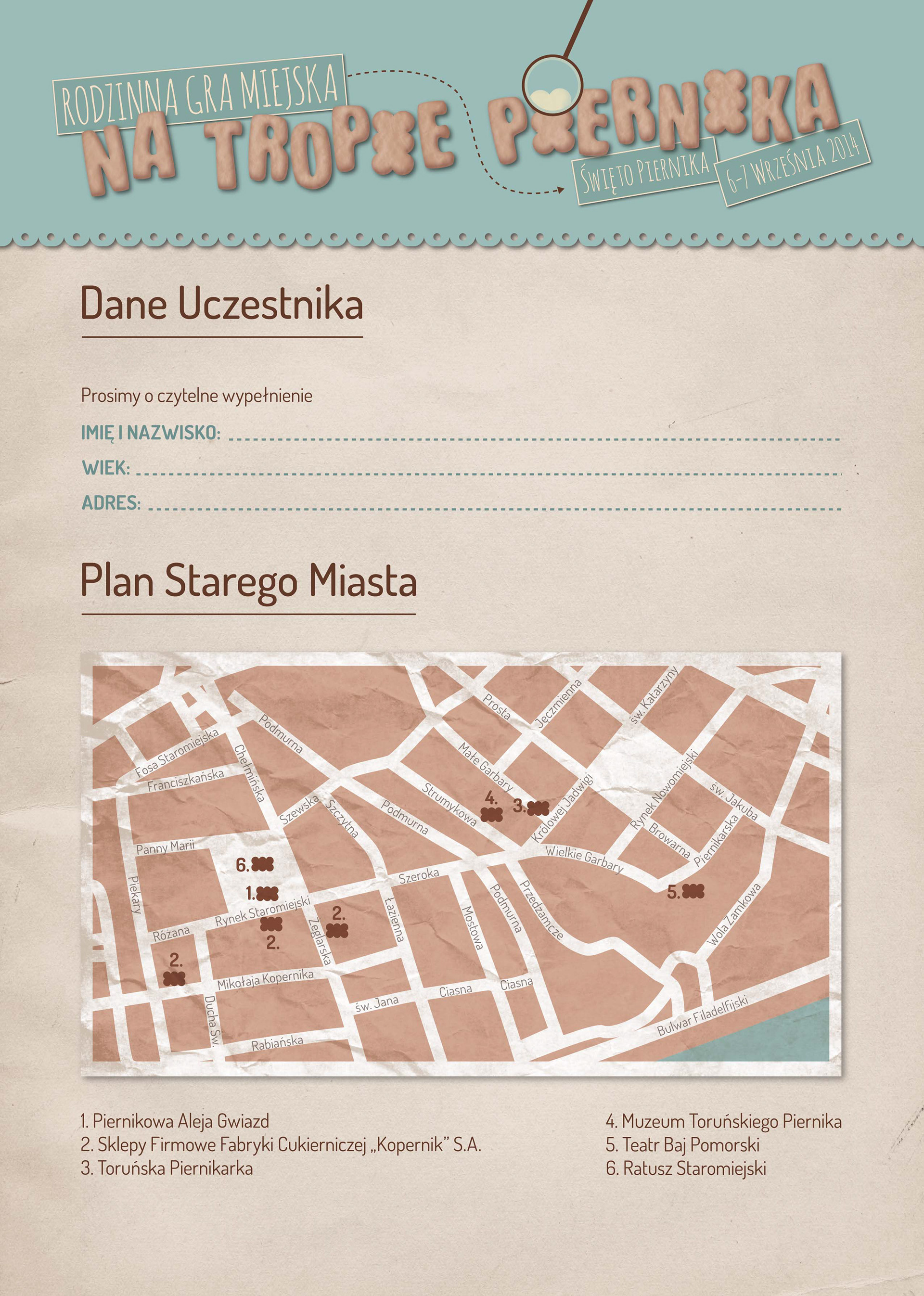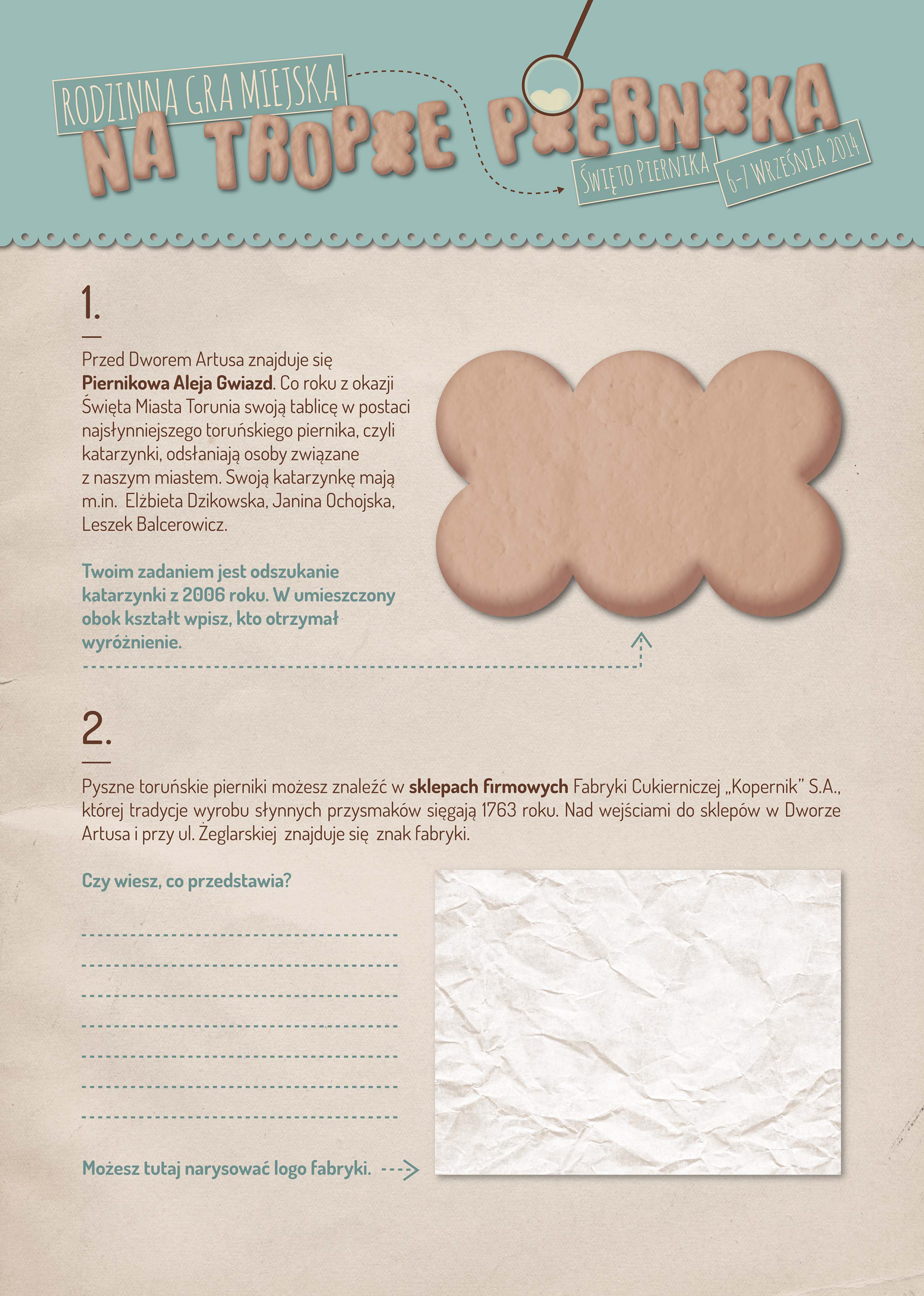 Karty zadań do gry miejskiej "Na tropie piernika" organizowanej w Toruniu z okazji Święta Piernika (2014) / Graphic design of task cards for the city game on Gingerbread Festival in Toruń (2014) /