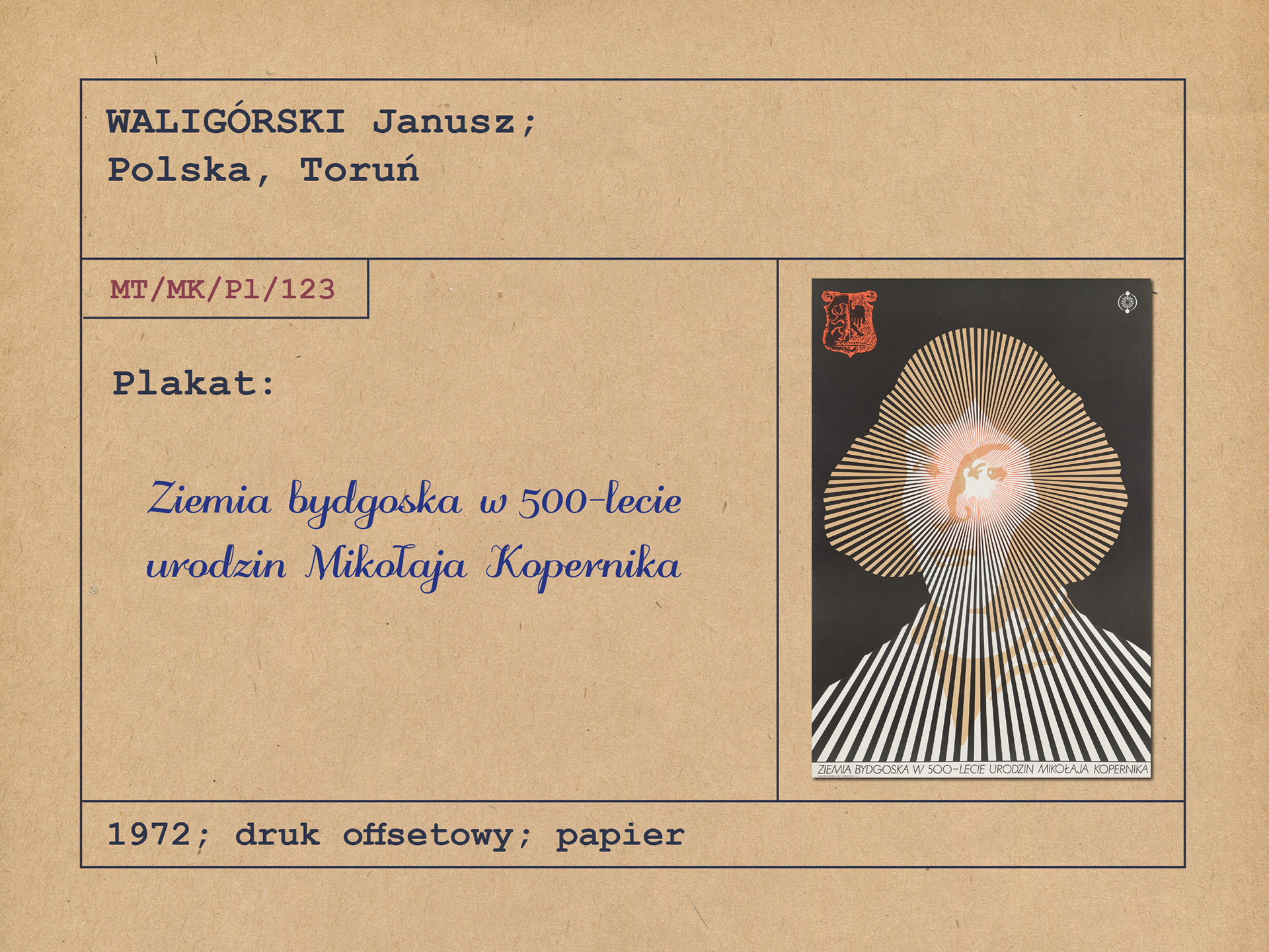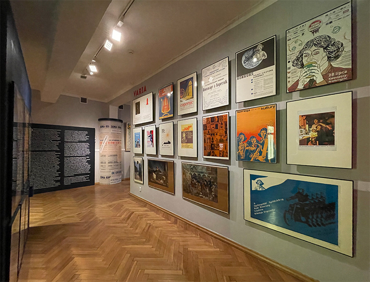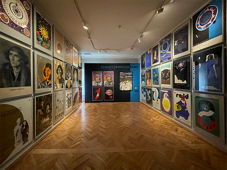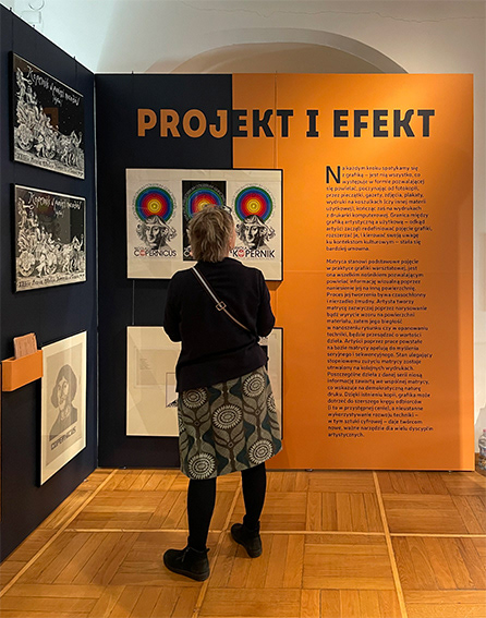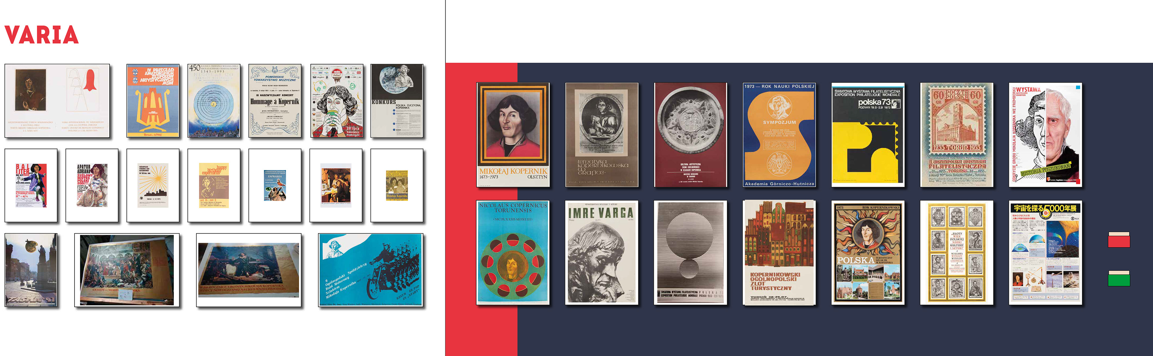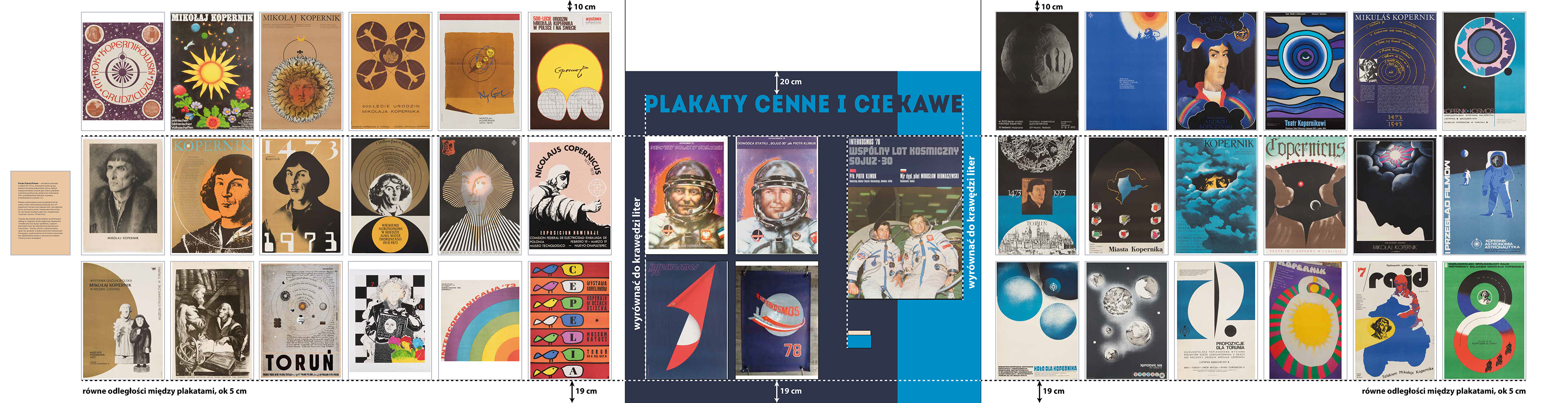 Kolekcja plakatów, w stosunku do ilości miejsca ekspozycyjnego, była na tyle liczebna, że niektóre ściany musiały zostać nimi wypełnione po sam sufit, w dodatku tak gęsto, że pomiędzy obiektami nie było już miejsca na ich opisanie. Zaprojektowałam więc podpisy w formie kart bibliotecznych, które można było wziąć do ręki i na podstawie kolorowej miniaturki odnaleźć odpowiedni plakat na ścianie.