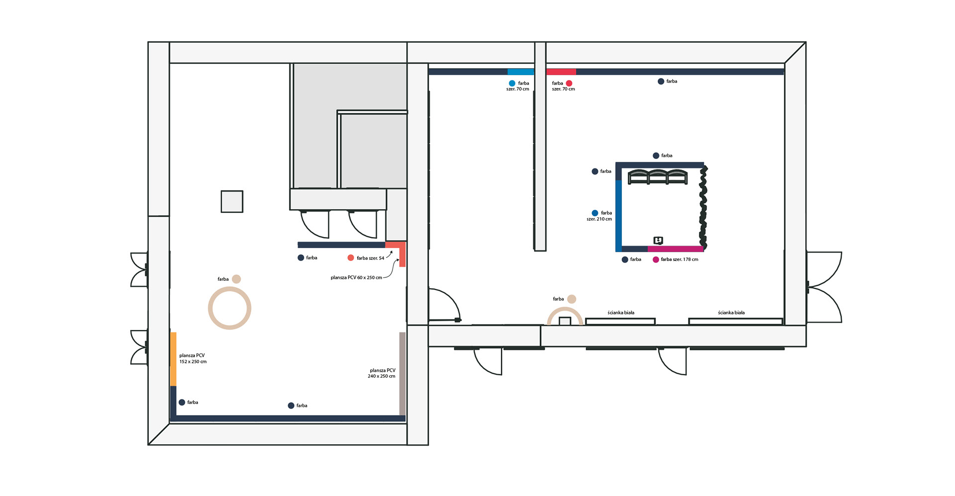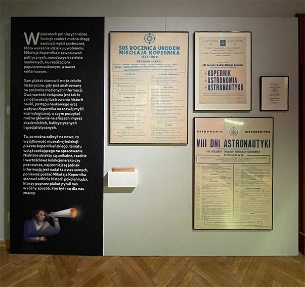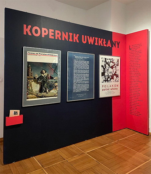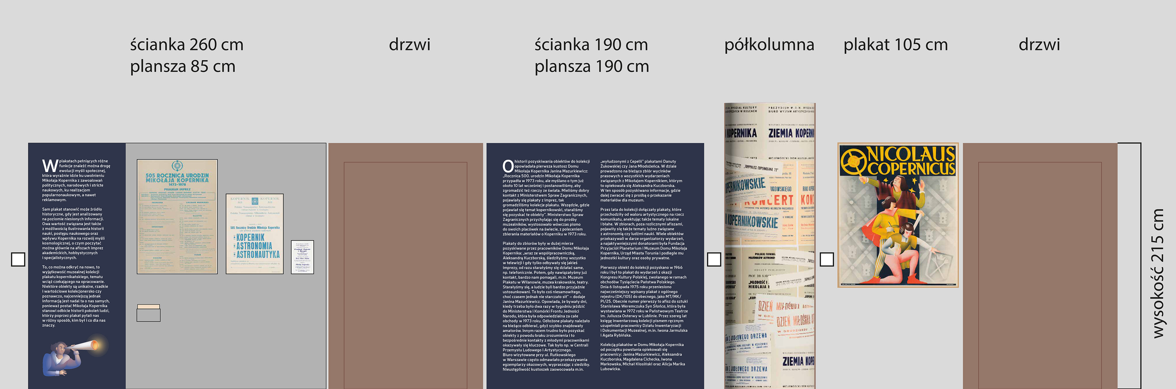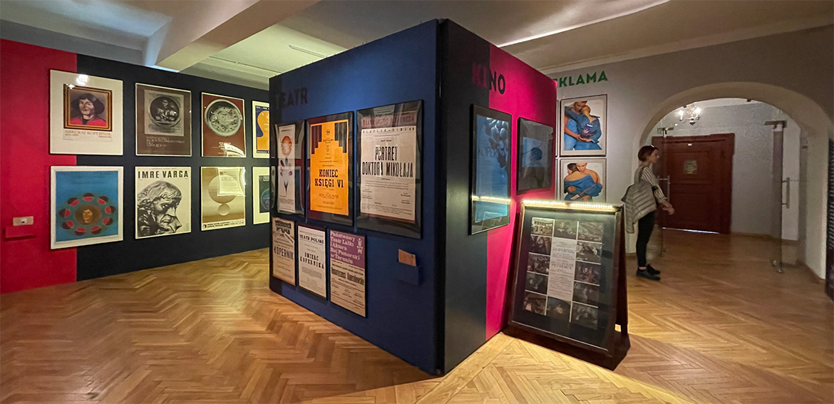Projekt ekspozycji opierał się na narzuconym przez kuratorów podziale kolekcji na 6 części tematycznych. Oznaczyłam je wyraźnymi kolorami, inspirując się motywem tęczy, pojawiającym się często na plakatach. Chciałam również symbolicznie zasugerować zwiedzającym przestrzeń, do której plakaty były pierwotnie projektowane, czyli ulice miasta. Afisze wyeksponowałam na słupach reklamowych, zaprojektowałam też neon z napisem Teatr, a stary potykacz z plakatami filmowymi zapraszał widzów do zaaranżowanej sali kinowej, gdzie można było obejrzeć prezentację z reprodukcjami plakatów, które nie zmieściły się fizycznie na ścianach galerii.