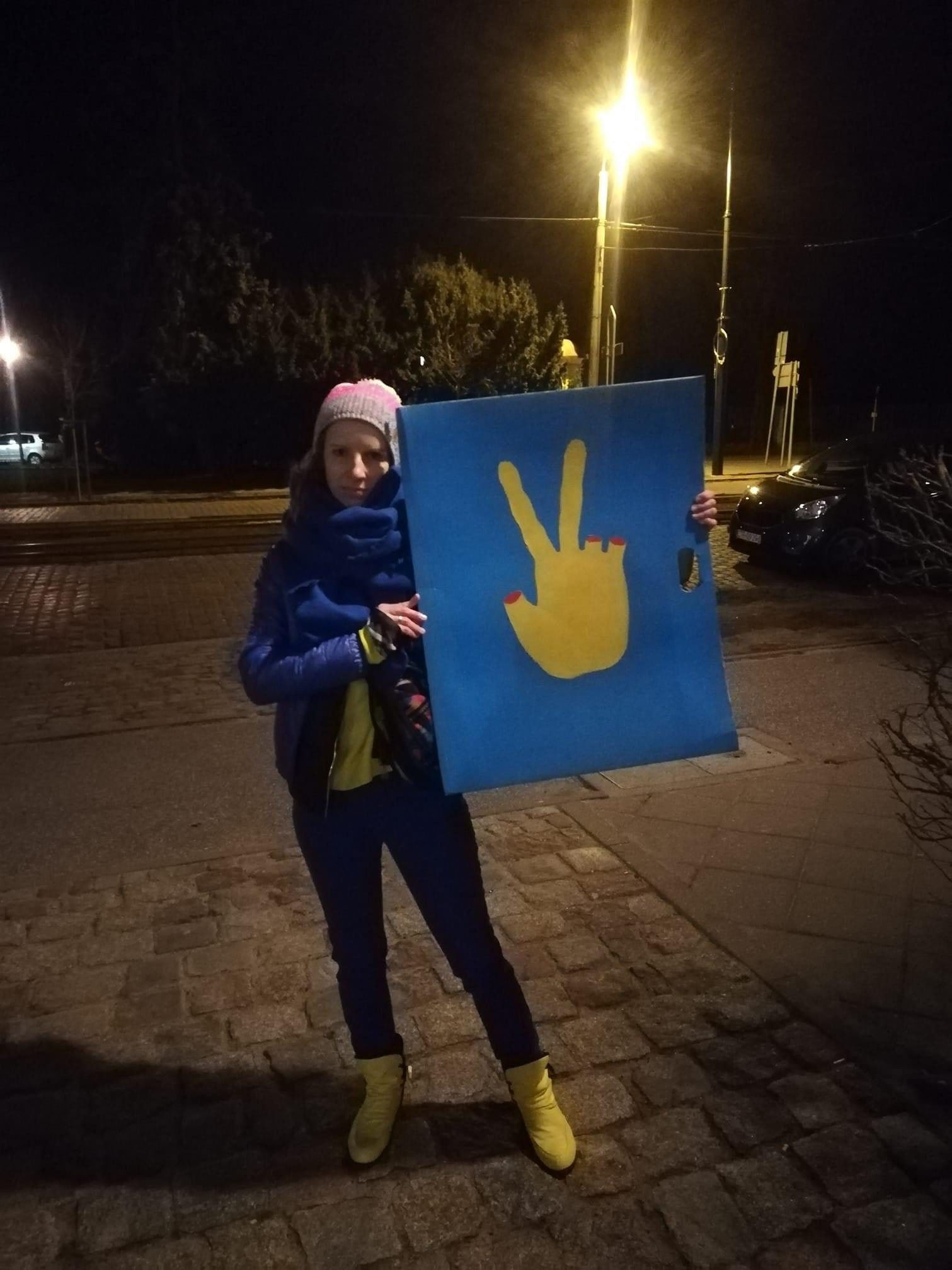 Plakat, który powstał w odruchu solidarności z Ukrainą zaatakowaną przez Rosję. Najpierw spontanicznie namalowałam go akrylami na tekturowej teczce na rysunki, jako transparent na pierwszą manifestację wspierającą Ukrainę a potem przeniosłam pomysł na grafikę wektorową. Jest to symbol zwycięstwa i pokoju, pomimo tego, że walka jest nieuczciwa i niesie ze sobą nieocenione straty. Kolory flagi Ukraińskiej są w tej chwili dla każdego oczywiste, a krwista czerwień to też kolor komunistycznej Rosji. / The poster was created in an impulse of solidarity with Ukraine attacked by Russia. First, I spontaneously painted it with acrylics on a cardboard folder for drawings, as a banner for the first demonstration supporting Ukraine, and then I transferred the idea to vector graphics. It is a symbol of victory and peace, despite the fact that the fight is unfair and carries with it invaluable losses. The colors of the Ukrainian flag are now obvious to everyone, and bloody red is also the color of communist Russia. /