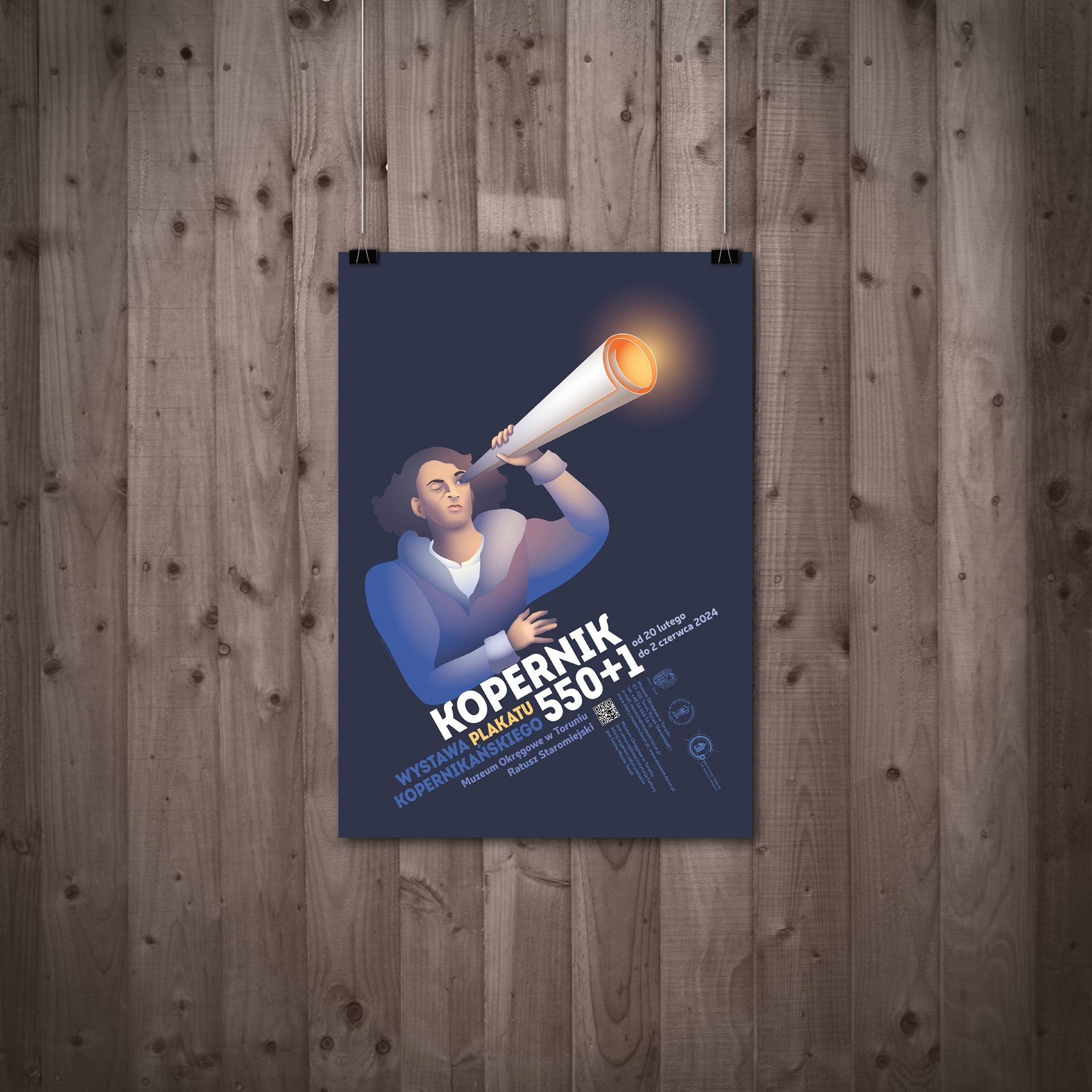 Plakat na wystawę plakatu kopernikańskiego "Kopernik 550+1" w toruńskim Muzeum Okręgowym, w Ratuszu staromiejskim (2024) / The poster for the poster exhibition "Kopernik 550+1" at District Museum in Old Town Hall in Toruń (2024) /